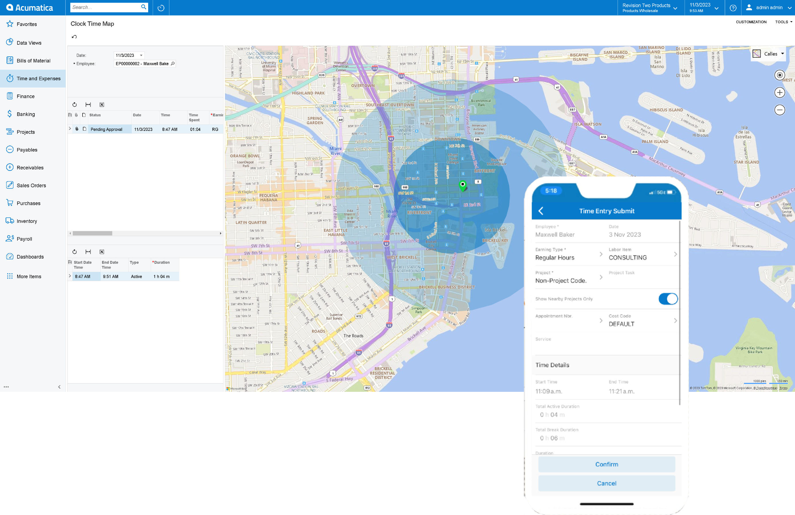 Une solution parfaitement intégrée qui améliore le suivi du temps pour les employés sur le terrain. Elle offre des fonctions de pointage dans l’application mobile Acumatica, ainsi que des améliorations de surveillance et de contrôle, via l’interface web d’Acumatica. Ces deux composantes collaborent pour offrir une expérience améliorée de suivi du temps, en tirant parti des capacités des modules Temps et Dépenses d’Acumatica.